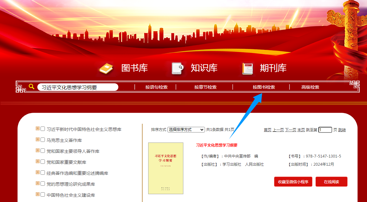 在图书库中检索《习近平文化思想学习纲要》(如图1),或依次点击图书库左侧的“习近平新时代中国特色社会主义思想库-学习辅导材料”栏目(如图2),即可查看《习近平文化思想学习纲要》一书。