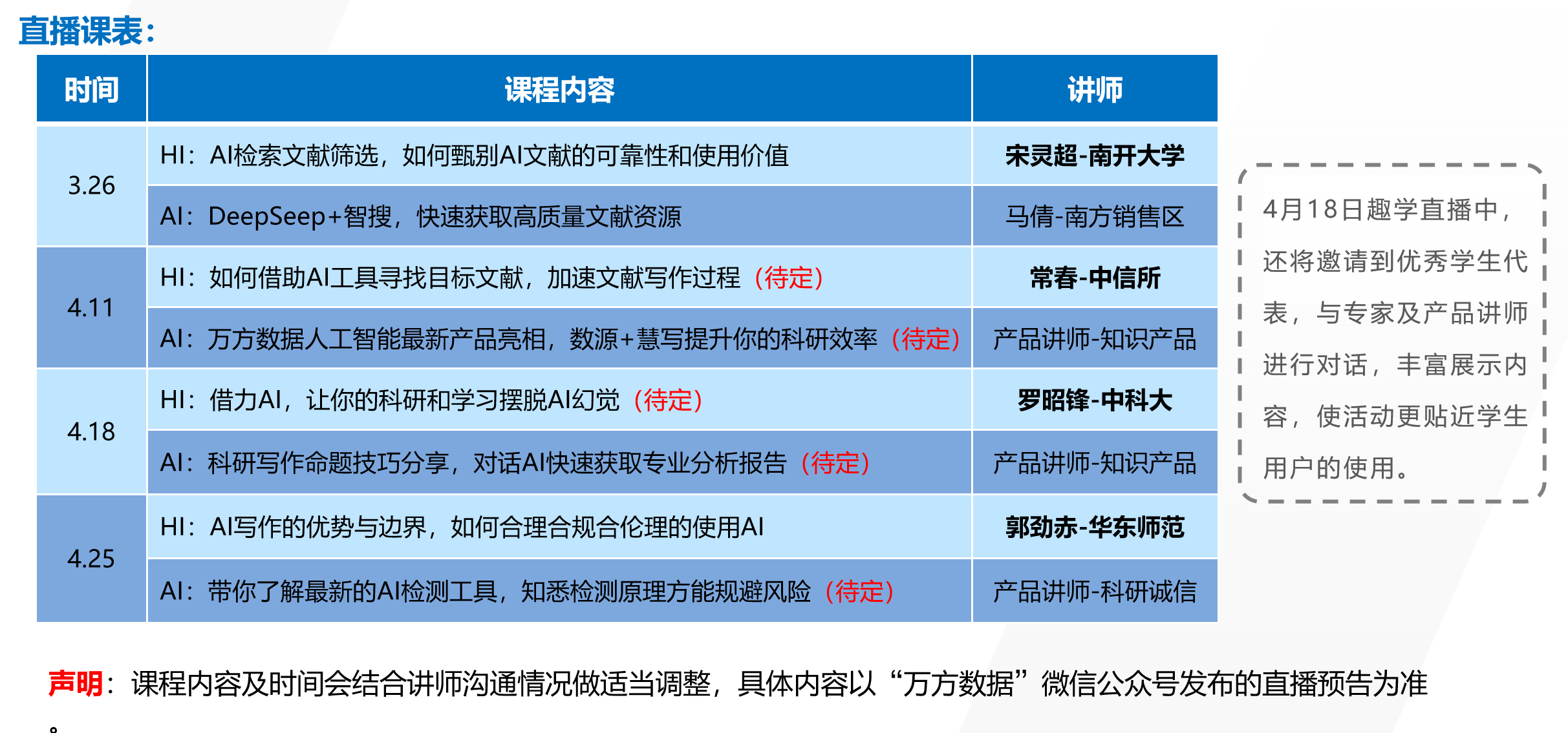 为助力大家提升学术能力、高效完成毕业论文及科研任务,图书馆联合万方数据知识服务平台,推出趣学直播课活动。现将相关直播日程通知如下: