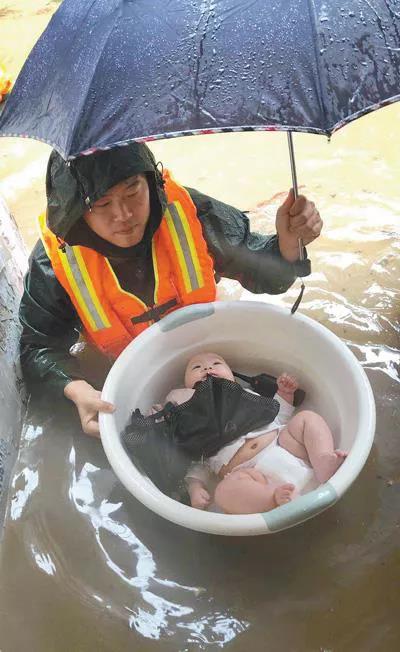 图为2020年6月27日,在宜昌市伍家岗区,消防员用水盆将3个月大的婴儿安全转移。 人民视觉 王方/摄