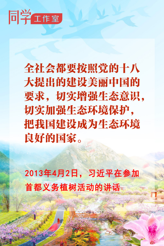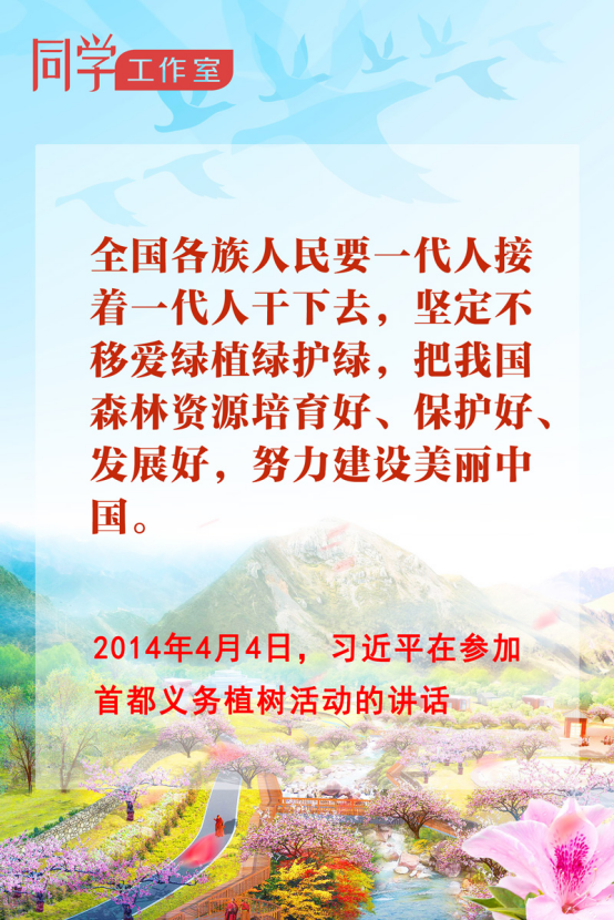 中华民族生生不息,生态环境要有保证。开展全民义务植树是推进国土绿化的有效途径,是传播生态文明理念的重要载体。3月12日是我国的植树节,让我们一起来回顾习近平总书记在历年植树节活动上的重要讲话,学习感受总书记的绿色情怀。