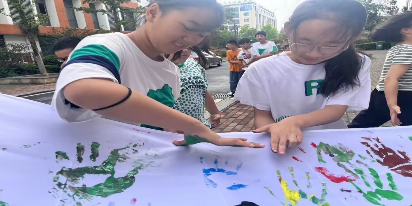 美术教育不仅仅在课堂中,还在日常生活中,为了增强学生的艺术体验,促进学生的艺术修养养成。活动最后一日,社会实践团队开展了“有趣的手印打卡”活动。活动开展前,团队成员一同定制了有关此次“三下乡”社会实践活动的旗帜,组织校园内的学生们按下了五彩斑斓的手印,留下了美好的回忆。同时积极倡导大家学习美术、体验美术、感知美术,提升艺术鉴赏能力和对美的感知能力。活动现场呈现一片欢乐的气氛,各年级学生们都踊跃参加。