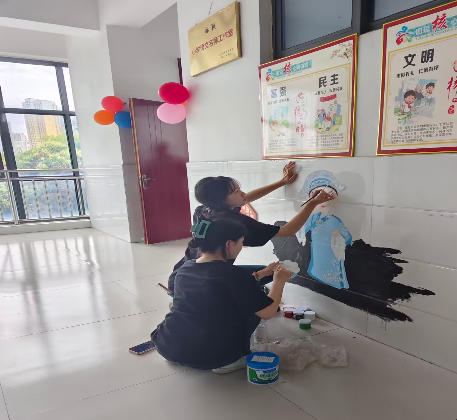 校园环境作为学生学习的重要场所,同时也是开展美育的重要平台。打造优美的校园环境,对于培养学生的审美品格,促进学生全面发展有着重要意义。美育不仅局限在课堂,更在日常的学习生活之中。活动的开展旨在推动学生们在日常的校园生活中,无时无刻感受到美的存在。活动第二日,实践团队成员带着准备好的绘画材料,开展校园环境的美化。团队成员结合中华优秀传统文化中的经典美术题材,对校园中的诸多场景进行了认真细致美化,例如墙绘京剧中“生、旦、净、末、丑”五大行当。美化后的校园环境,增加了孩子们对绘画和学习传统文化的兴趣,启蒙了学生们的审美情趣。