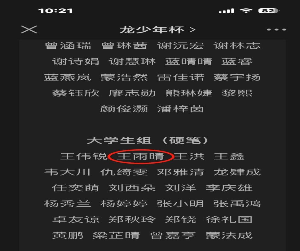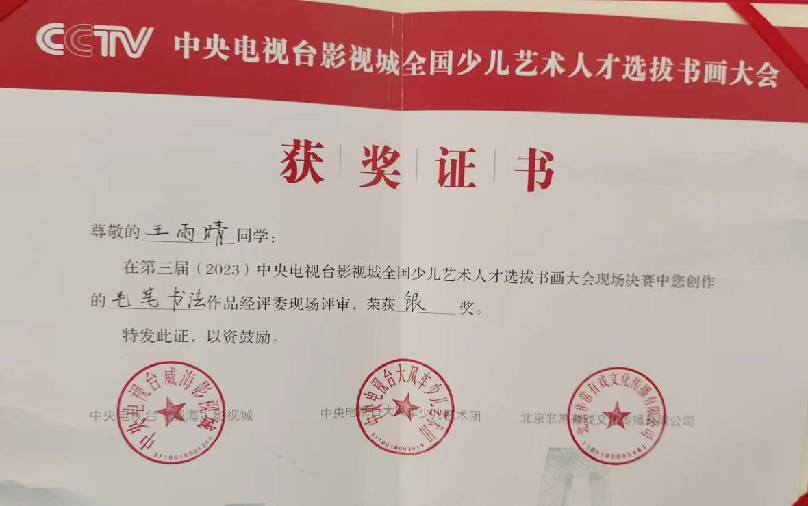 第三届中央电视台影视城全国艺术人才选拔书画大赛,我校2022级水文与水资源工程专业王雨晴同学作品在全国2万余件作品中脱颖而出,荣获国家银奖;龙少年首届全国青少年书法征集活动比赛中获优秀奖。