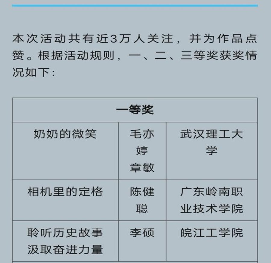 本次大赛全国共有近三万人关注,近百幅作品参赛,经专家评委反复甄选,共选出3幅一等奖作品,5幅二等奖作品,10幅三等奖作品。这些优秀作品从不同角度,不同侧面生动展现了助老志愿服务动人的瞬间。我校投稿的摄影作品“聆听历史故事 汲取奋进力量”不仅从内容上展示了助老志愿服务新魅力,助老志愿服务新元素,涵养向上向善的志愿服务新风尚,还具有较强的思想性、时代性,同时在艺术表达上也有创新性。