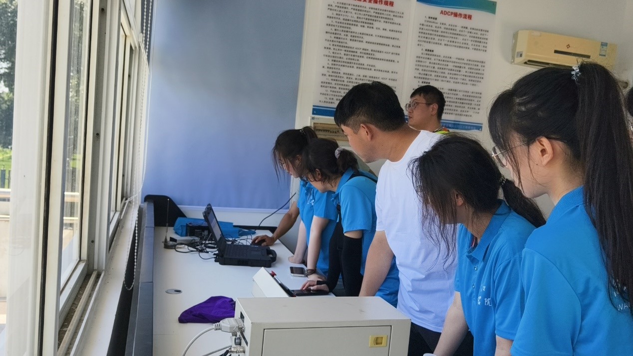 实践团队成员在工作人员指导下,步入测流缆道房,听取ADCP 测流原理介绍并实操测流,亲身体会水文数据的采集过程。