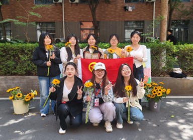 活动期间,两面鲜艳的中国共青团团旗在校园内格外醒目,成为青春打卡的 “精神坐标”。同学们或手持团旗驻足于教学楼前,或与团旗并肩立于校园标志性景观旁,以向日葵般灿烂的笑容、挺拔的身姿与团旗同框。镜头下,有人庄重敬礼,有人比出象征青春的手势,更有人围簇团旗合影,每一帧画面都流淌着对共青团的崇敬与热爱,定格了新时代青年与团旗同向、与时代同行的赤子之心。