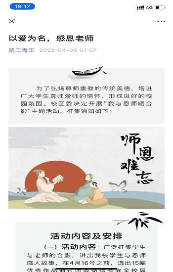 校团委坚守思想宣传主阵地,充分利用各级团属新媒体矩阵主动发声,开展正面宣传和引导,凝青聚力彰显战“疫”路上的青春担当。定期推送抗疫知识、宣传抗疫政策,开展“以爱为名、感恩老师”我与老师合影征集、“献礼建团百年微视频”征集、“喜迎校庆·情系新利体育手机端官网登录入口”征文、摄影、视频征集活动等,同时在新媒体平台上同步展示优秀作品。