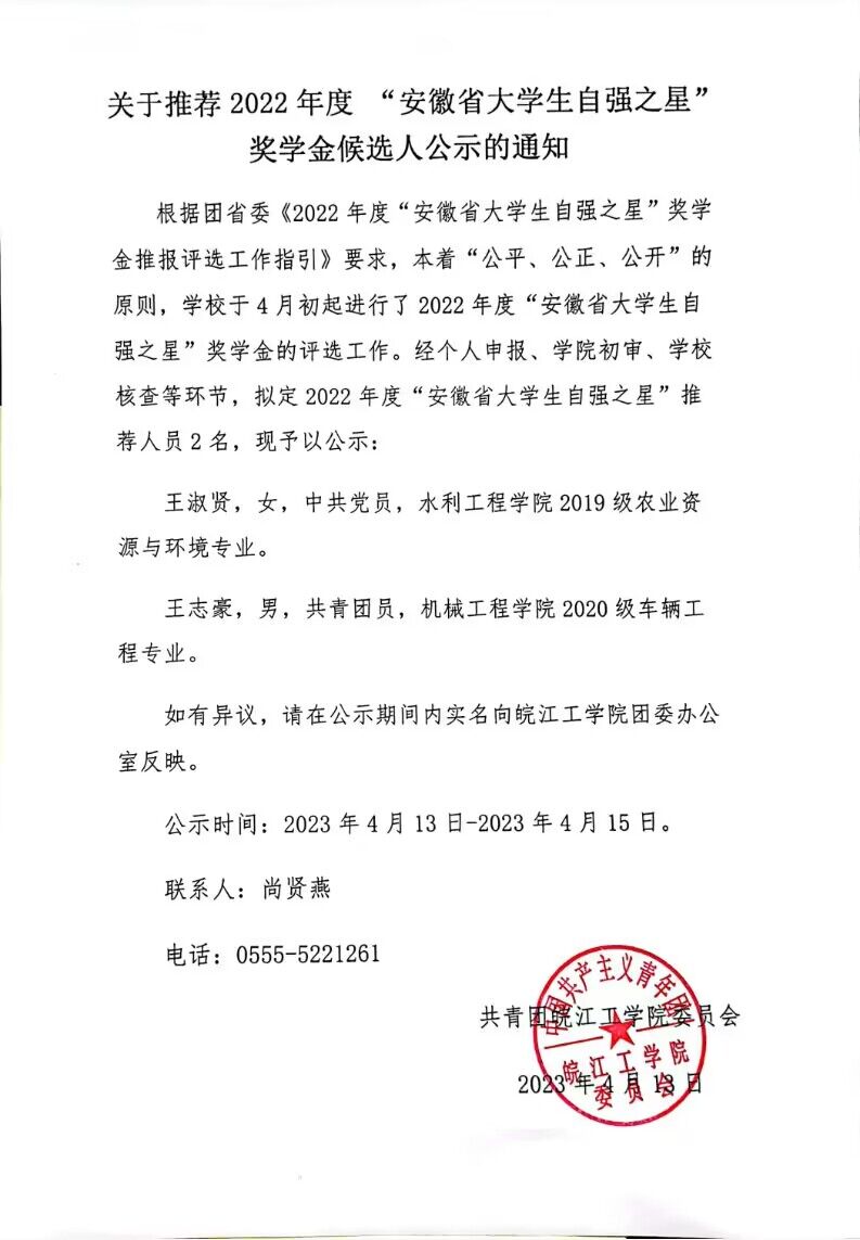 关于推荐2022年度“安徽省大学生自强之星”奖学金候选人公示通知