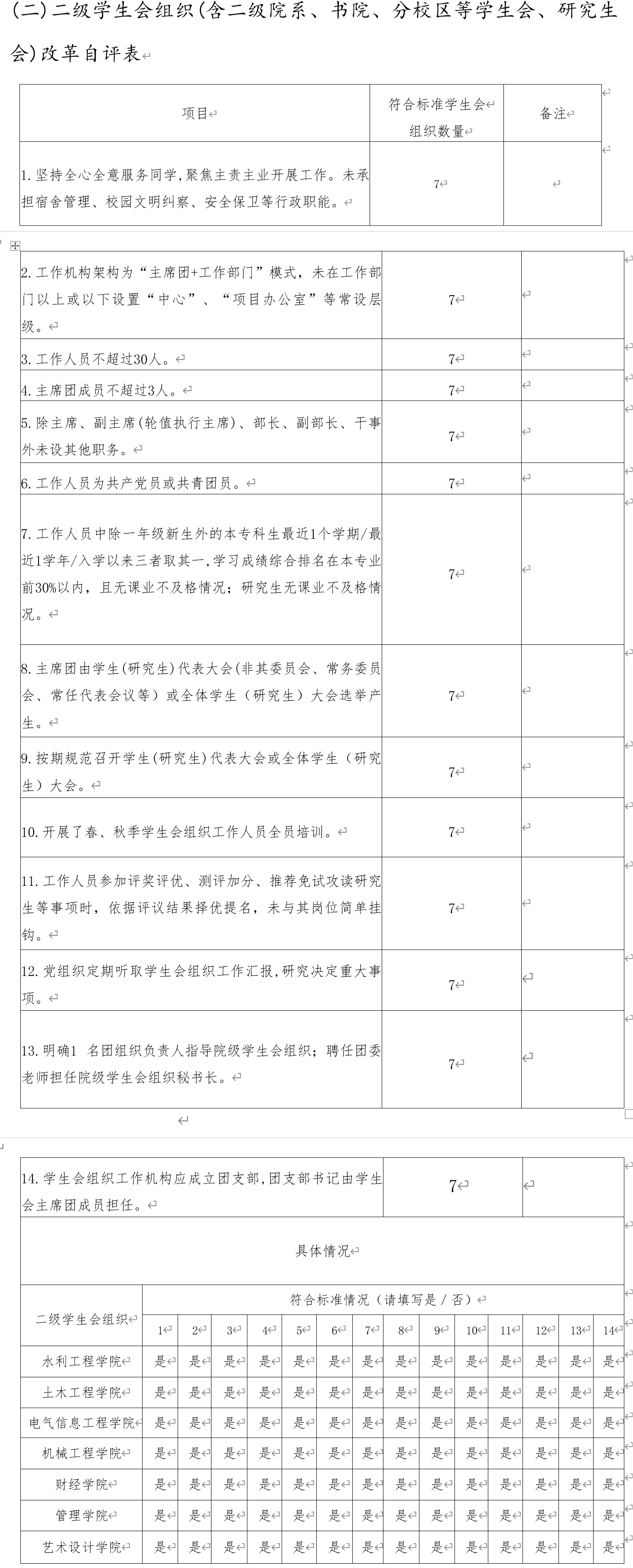为落实共青团中央、教育部、全国学联联合下发的《关于推动高校学生会(研究生会)深化改革的若干意见》,并结合《关于巩固高校学生会(研究生会)改革成果的若干措施》文件要求,接受广大师生监督,现将我校2022—2023学年学生会(研究生会)改革情况公开如下。