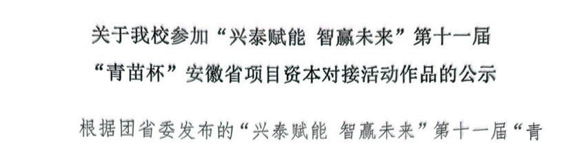 关于我校参加“兴泰赋能智赢未来”第十一届“青苗杯”安徽省项目资本对接活动作品的公示 关于我校参加“兴泰赋能智赢未来”第十一届“青苗杯”安徽省项目资本对接活动作品的公示
