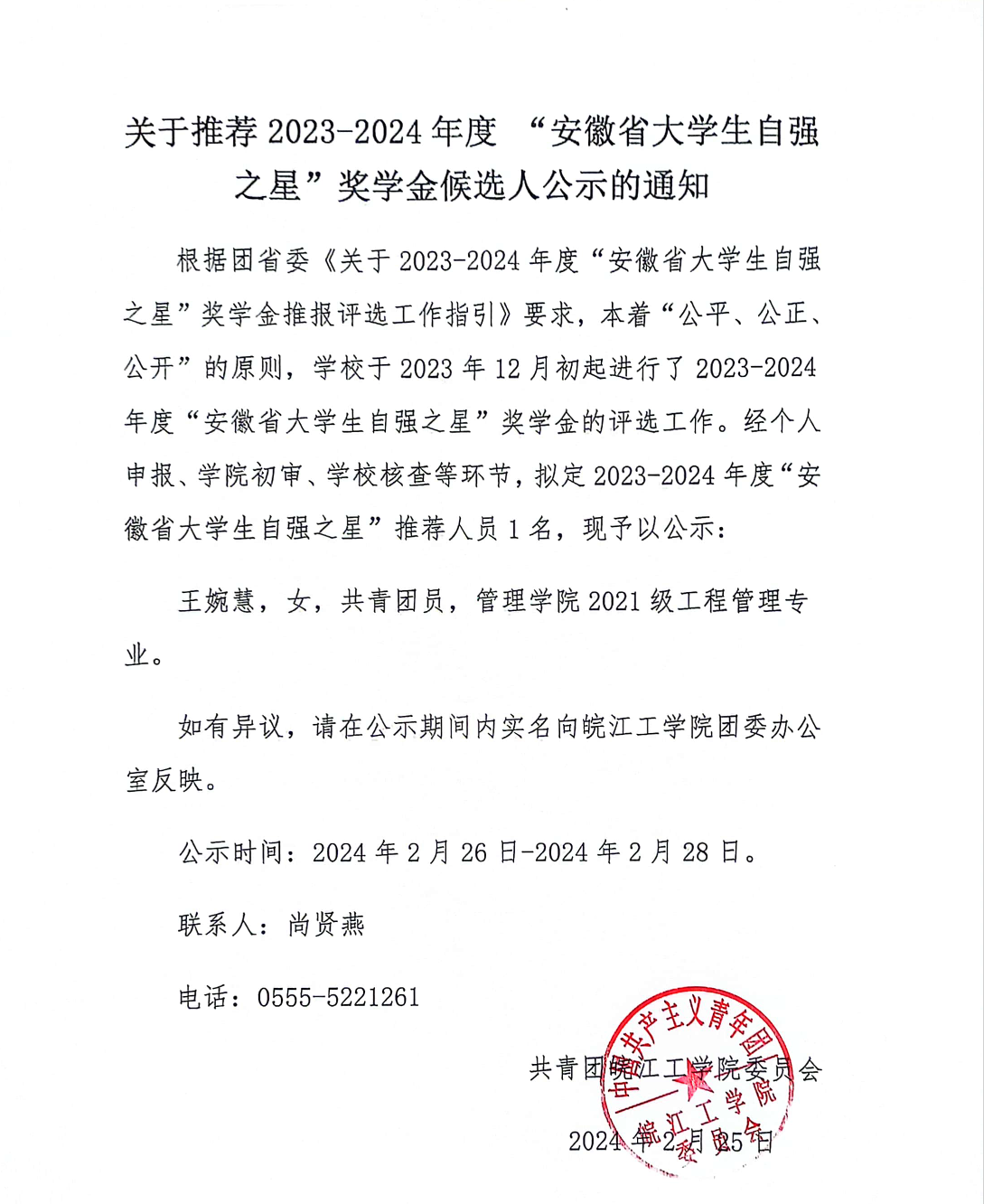 关于推荐2023-2024年度“安徽省大学生自强之星”奖学金候选人公示的通知