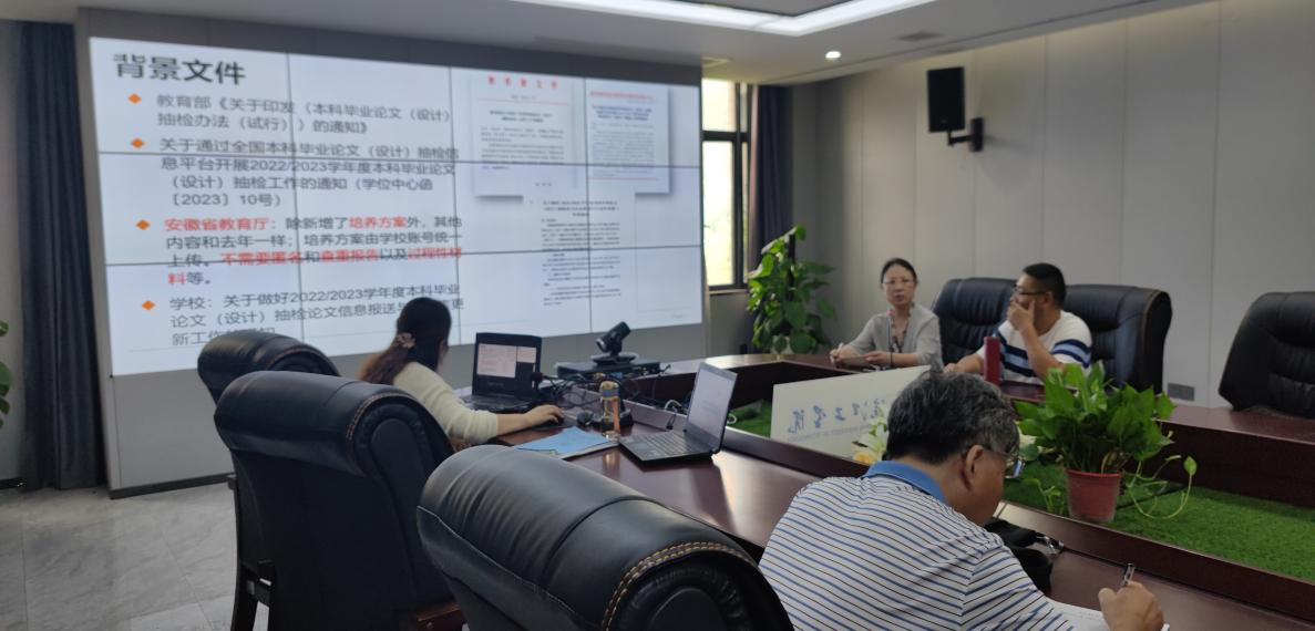 根据教育部学位与研究生教育发展中心《关于通过全国本科毕业论文(设计)抽检信息平台开展2022/2023学年度本科毕业论文(设计)抽检工作的通知》(学位中心函【2023】10号)、安徽省教育厅督导办的相关通知要求,为做好我校2022/2023学年度本科毕业论文(设计)抽检论文信息报送与专家库更新工作,9月4号上午,教务部部长江冰、副部长葛文生、各学院教学副院长(助理)、教学科研办主任及教务部相关负责人在F417召开毕业论文(设计)抽检工作动员会。