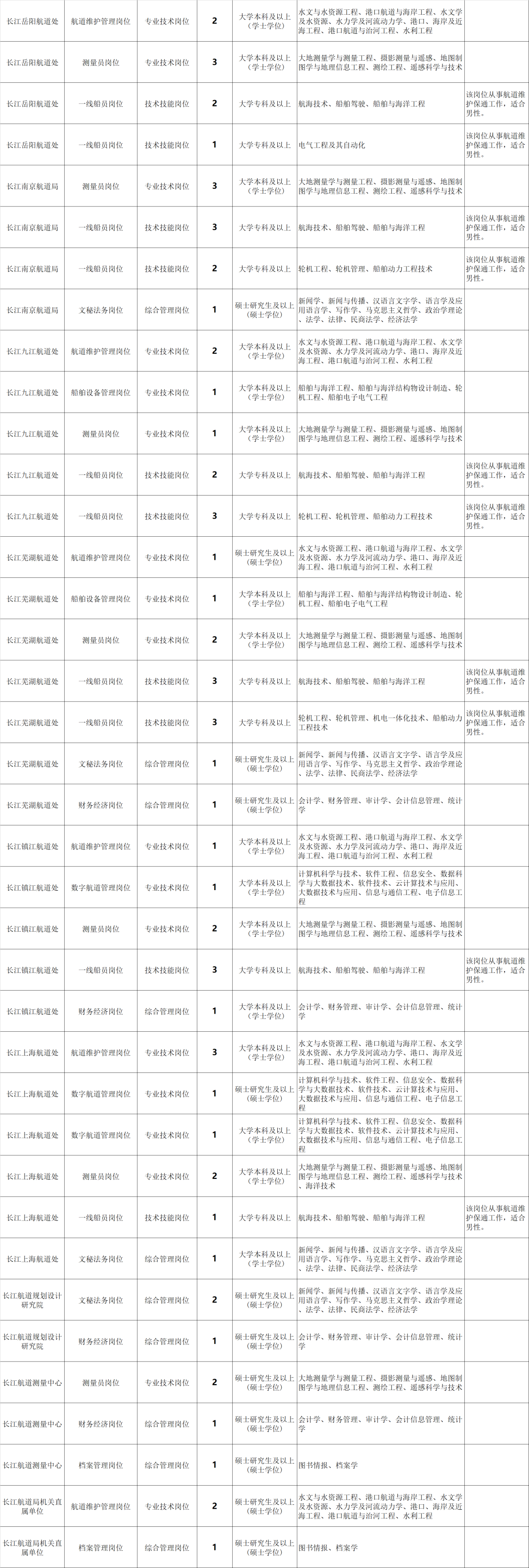 此次发布2024年度招聘计划的单位包括:长江宜宾航道局、长江泸州航道局、长江重庆航道局、长江涪陵航道处、长江万州航道处、长江宜昌航道局、长江荆州航道处、长江岳阳航道处、长江武汉航道局、长江九江航道处、长江芜湖航道处、长江南京航道局、长江镇江航道处、长江上海航道处、长江航道测量中心、长江航道规划设计研究院、长江航道局机关直属单位,拟招聘事业编制人员140人,具体计划详见《长江航道局2024年度事业编制人员招聘职位信息表》(附件,以下简称《职位信息表》)。
