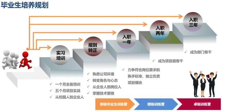 通过集中培训和持续性岗位培养相互穿插,全程跟踪保障毕业生能力持续提升。