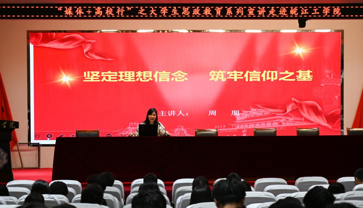为学习贯彻习近平总书记关于教育的重要论述,全面落实立德树人根本任务,把思想政治教育贯穿人才培养全过程,加强和改进大学生思政教育,9月25日下午,由马鞍山日报社、市委宣讲团、市教育局联合主办的“建功时代 强国有我”大学生思政教育系列宣讲活动在18新利怎样举行。本次宣讲邀请了马鞍山市职业技术学院、马鞍山技师学院习近平新时代中国特色社会主义思想概论教研室主任、副教授周朋作为主讲人,以“坚定理想信念 筑牢信仰之基”为主题给我校学生带来了一堂生动、鲜活的思政课。