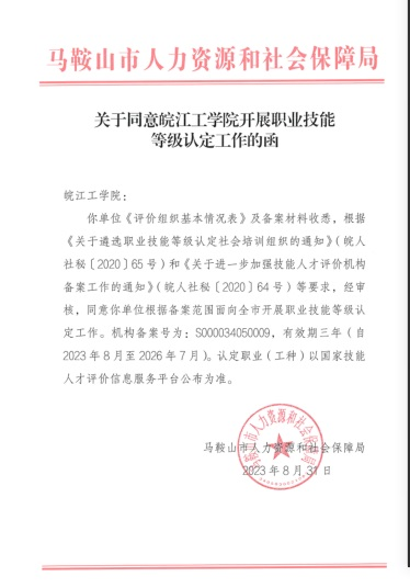 2023年初,在马鞍山市人社局关心指导下,我校继续教育学院积极组建申报,先后制定了职业技能等级评价服务规程、制度和细则,形成申报材料,历时近一年的攻坚克难,终于取得了满意的成果,已具备电工、企业人力资源管理师、工程测量员三个工种的职业技能等级认定资格。据悉,我校是马鞍山市第一所可以开展职业技能等级认定的本科高校。获批职业技能等级认定资格,也是我校落实国家“十四五”职业技能培训规划,拓展职业技能考培体系,提升社会化服务能力,形成“科学化、社会化、多元化”技能人才评价机制的重要举措。