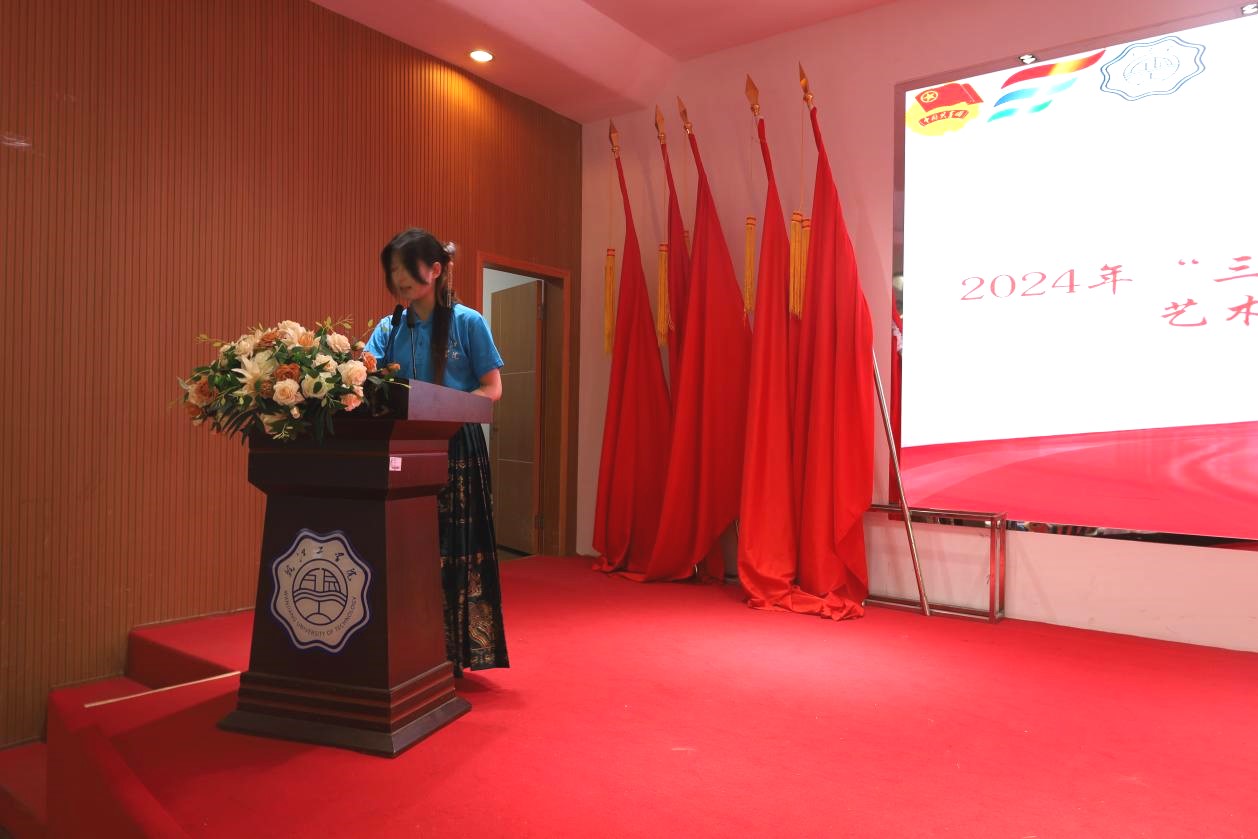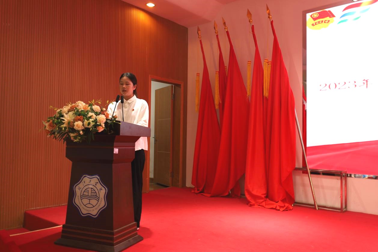 2023年度我校社会实践活动硕果累累,会上,通过视频播放的形式回顾了2023年度“三下乡”社会实践活动成果。随后,2023年省“三下乡”社会实践活动“优秀实践团队”成员代表、土木工程学院2021级王韩同学分享实践活动经验,她表示,深入扎实做好社会实践活动需要充分结合团队成员所长,同时要密切联系指导教师,邀请有经验的专家教授指导实践;既要怀抱梦想又要脚踏实地,制定好实践目标、善于团结合作、加强实践育人成果凝练和宣传。艺术设计学院2022级数媒专业陈佳佳同学代表2024年即将出征的实践团队负责人发言,她表示,在本次实践活动中,将与各团队勇担时代重任,奋勇争先,让青春在“三下乡”社会实践的舞台上熠熠生辉。