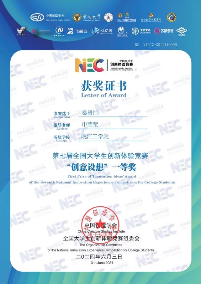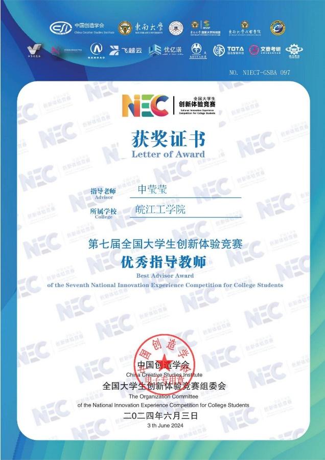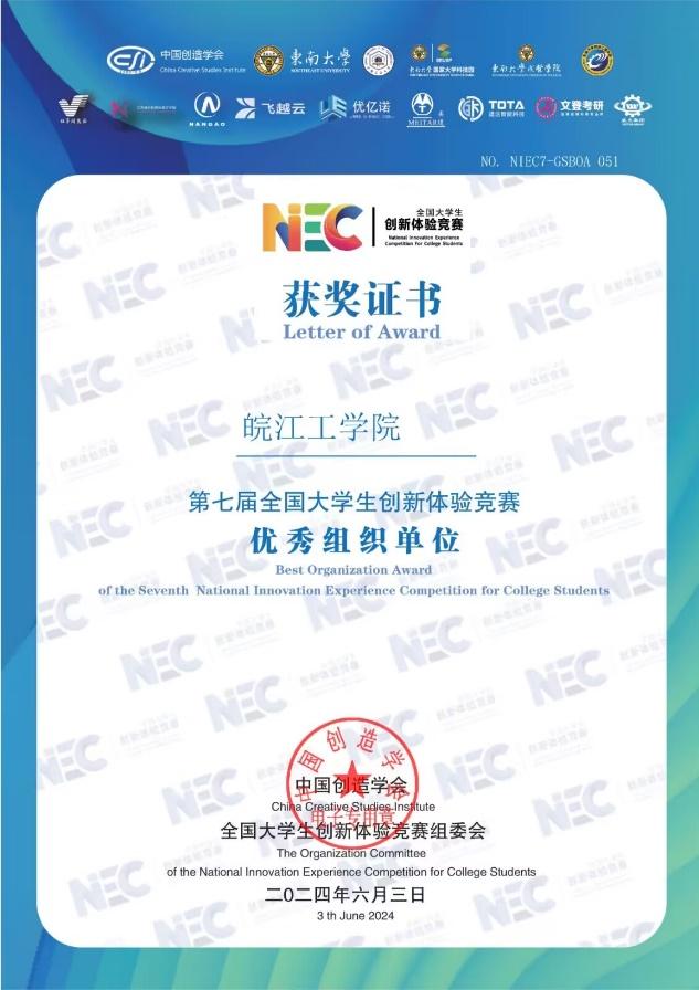 近日,第七届全国大学生创新体验竞赛总决赛落下帷幕。本次比赛于2024年5月在线上隆重举行,吸引了来自全国各地的众多优秀选手参赛。经过网络初评、复赛以及决赛评委会在线答辩评审等环节的激烈角逐,我校学生表现优异,秦毅恒同学获得全国一等奖一项,徐国斌、马骋骋、丁源同学共夺得全国三等奖三项,18新利怎样荣获“优秀组织单位”称号,申莹莹老师获得“优秀指导老师”称号。