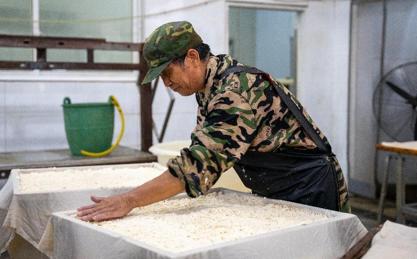 7月7日,实践团队来到了毛豆腐制作工厂。毛豆腐历经了数百年的传承,其香味飘散在徽州的大街小巷,已经成为一种深刻的徽州记忆的文化符号。实践团队与当地毛豆腐非遗传承人蒋光明先生取得了联系,蒋光明带领团队观看了毛豆腐制作过程:用优质黄豆,经筛选、浸泡、磨浆、过滤、压制、切块和发酵等工序,使毛豆腐这道经典徽菜更加极致。随着非遗的新见识、新视野的不断深入人心,毛豆腐不仅在当地大放异彩,也可以通过网购等新型方式“飞入寻常百姓家”,使广大人民的生活中不断植入非遗文化“基因”,播撒文化自信种子。当古老的非遗文化与新时代交织,相信会释放出更加绚丽的生命力,同时当代新青年也要积极响应非遗文化回归民间沛然生长,融入生活历久弥新的号召。