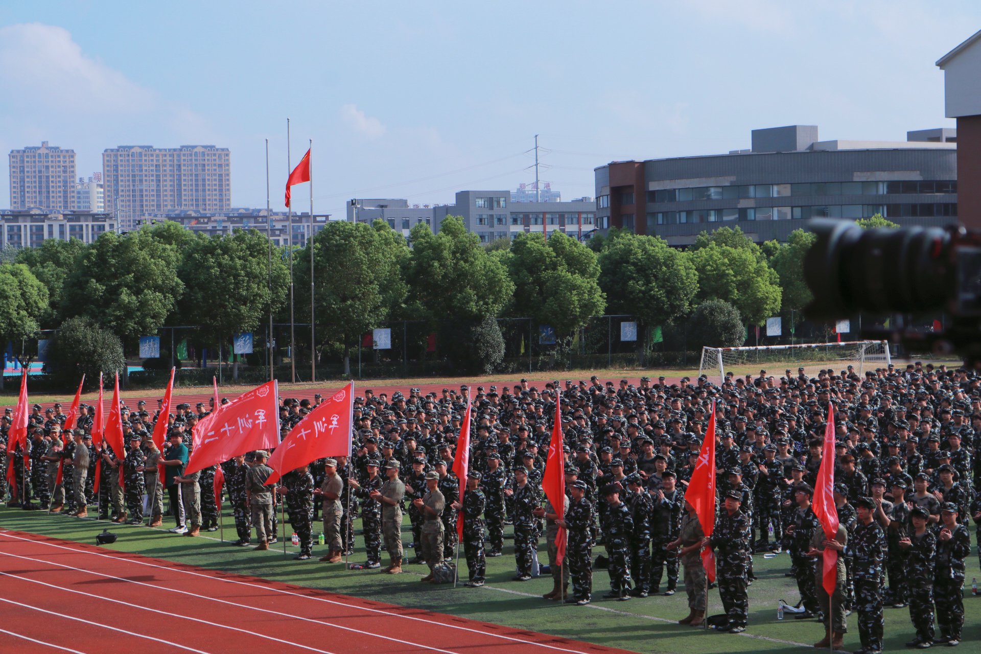 在军训动员阶段,侯进元宣读军训团成员名单,丁家云向军训部队授旗。迎风招展的红旗下,2024级新生开学典礼暨军训动员大会圆满结束。
