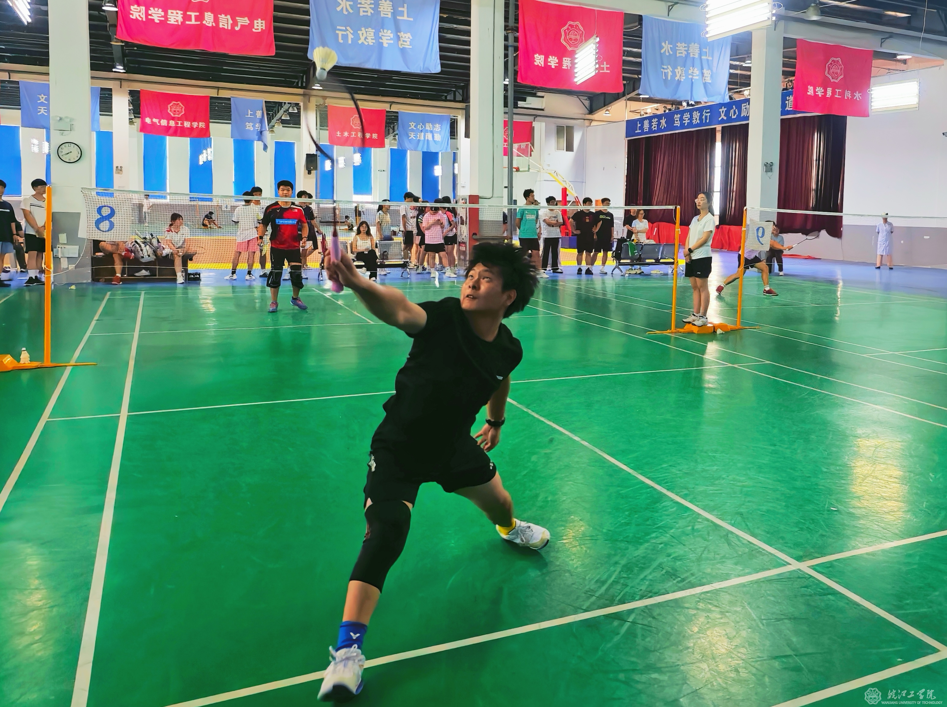 5月17日,我校第五届羽毛球团体赛在体育馆激情开赛。来自各学院的15支代表队汇聚一堂,展开了为期两天的激烈角逐。首日小组循环赛中,选手们个个精神饱满,挥拍扣杀间尽显青春风采。经过多轮精彩对决,最终八支强队脱颖而出,成功晋级次日的淘汰赛。