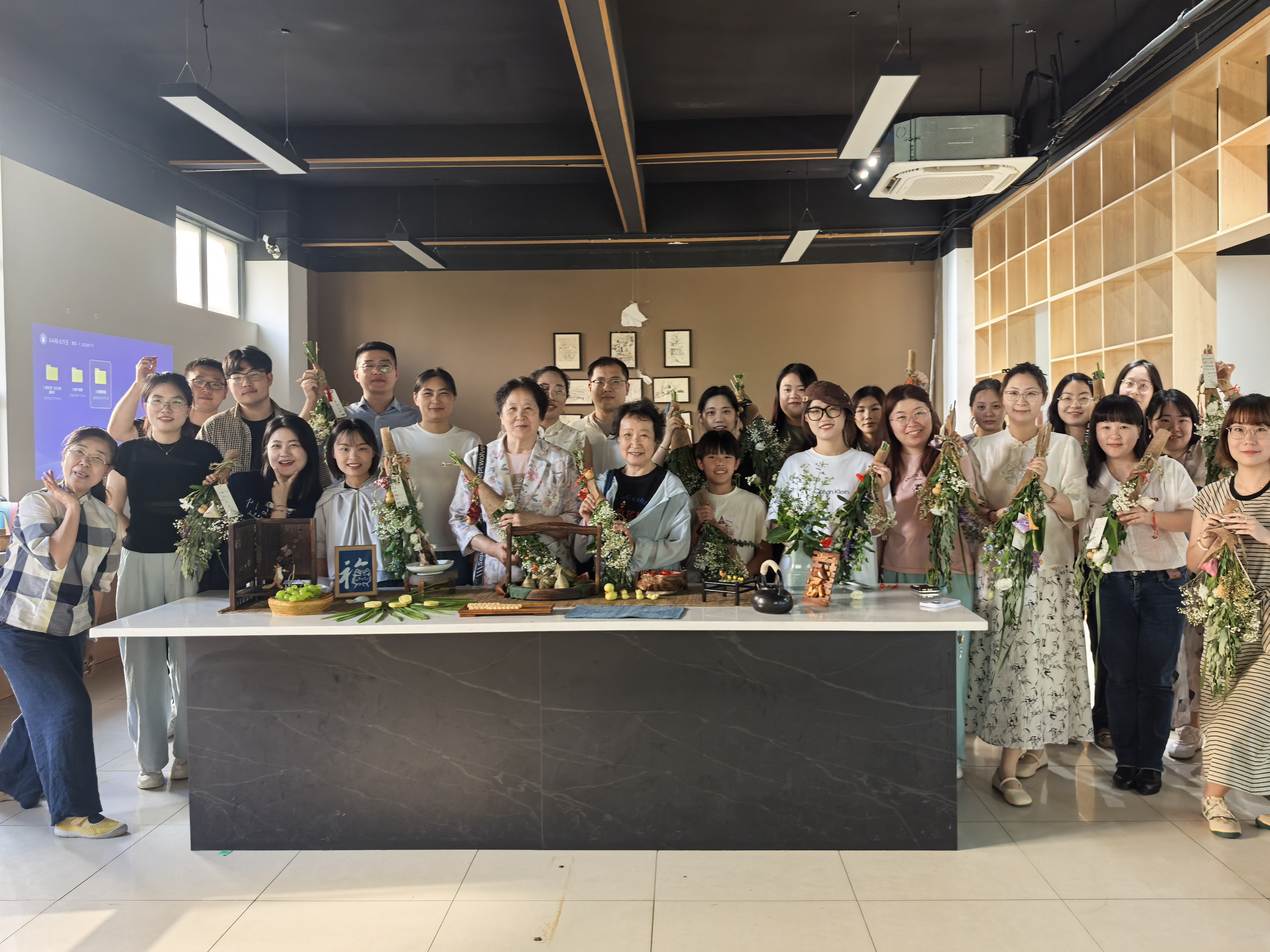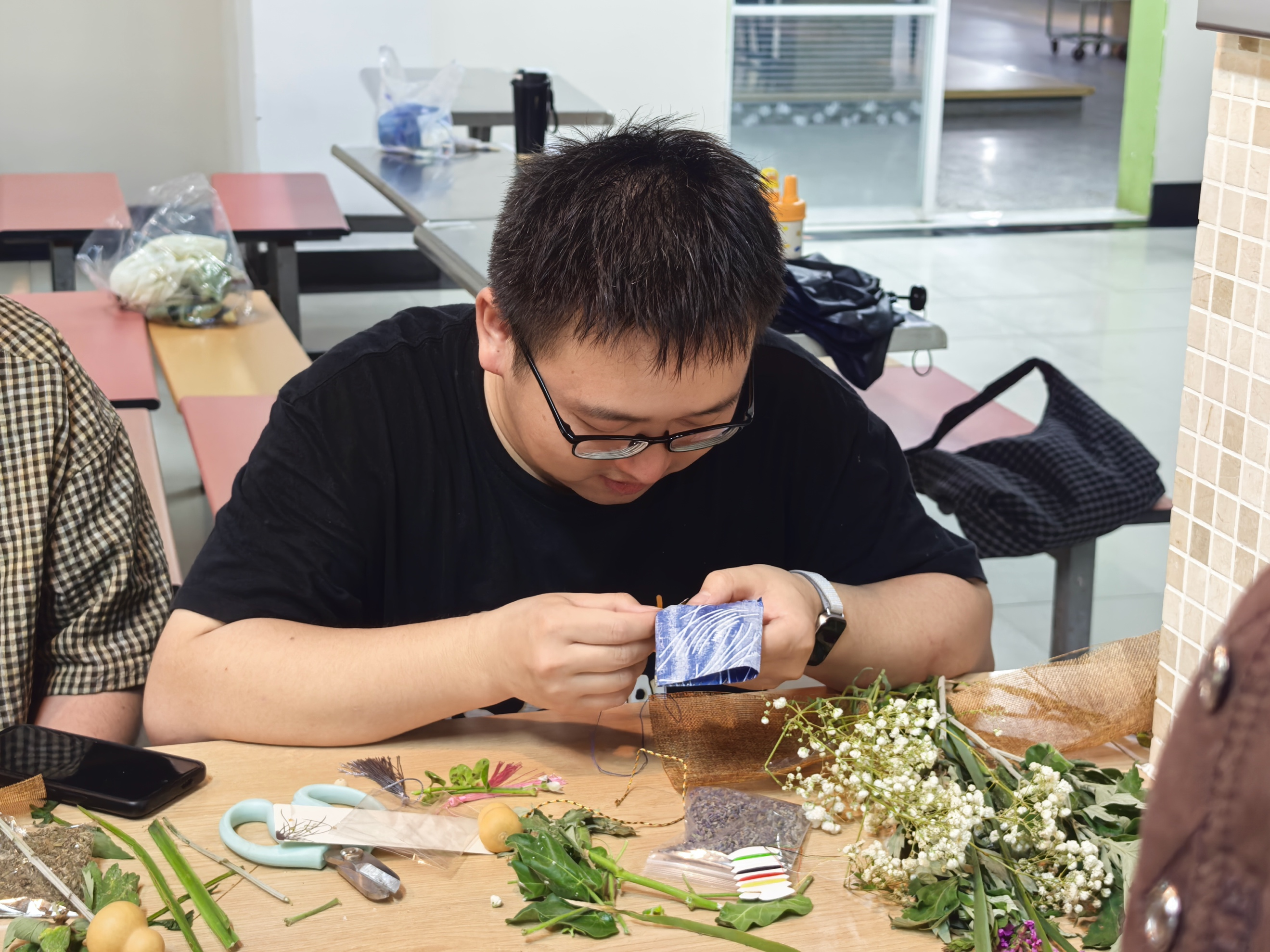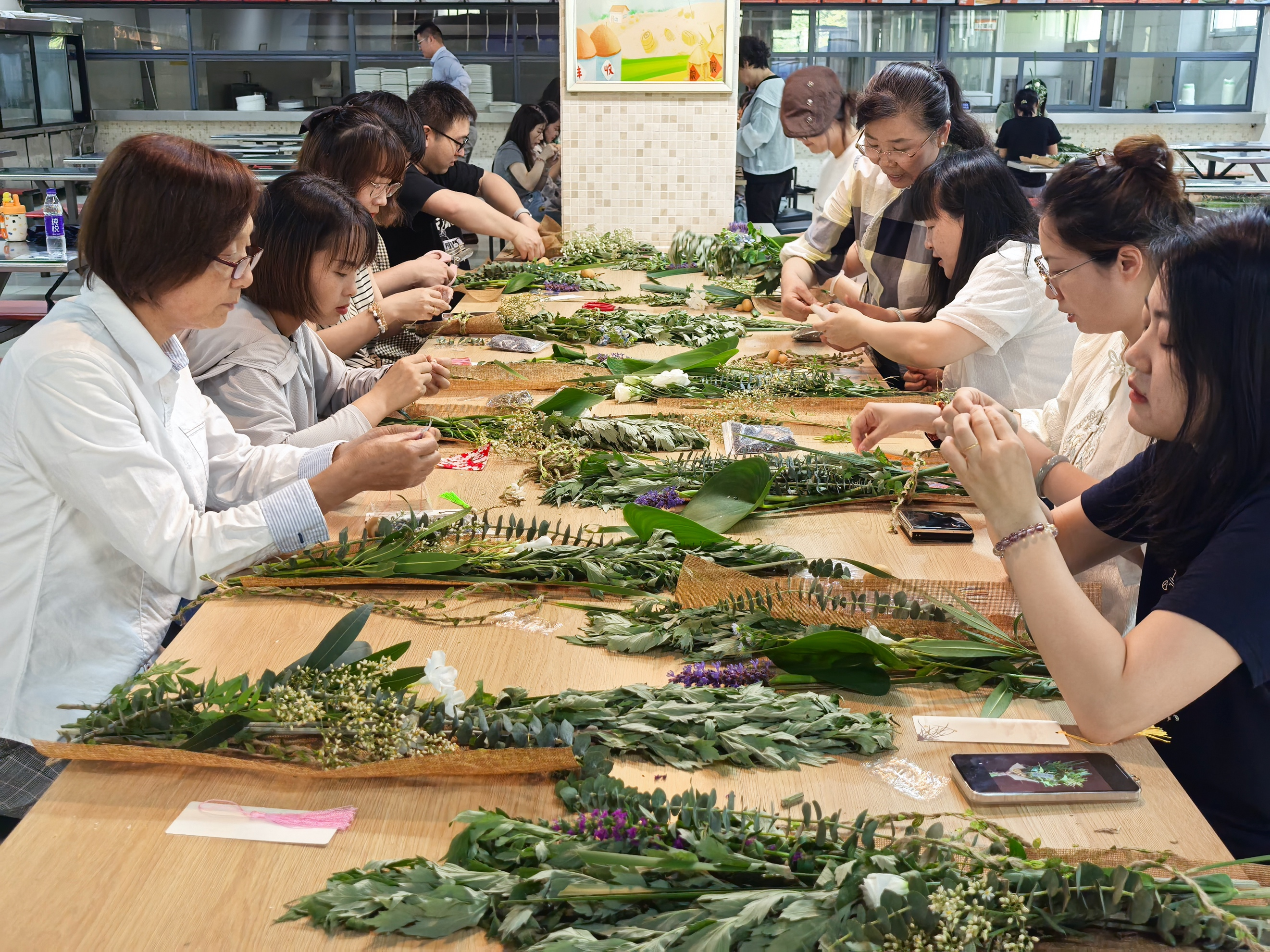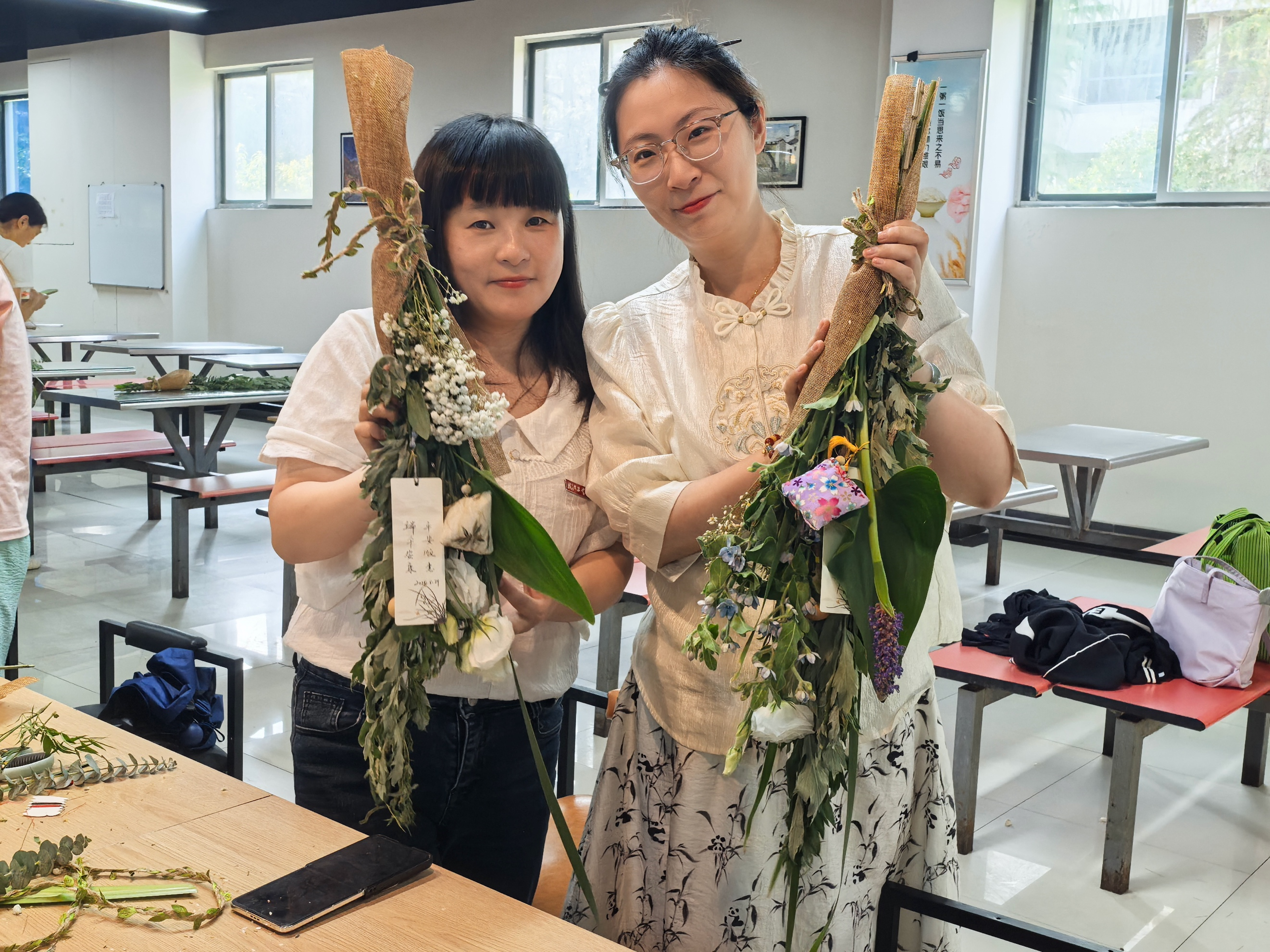 现场手作艾草花束门挂环节将活动推向高潮。巧手绑艾叶,细缝香囊包,开启了一场自然与传统对话的奇妙之旅。大家运用缤纷的花束与饰物,制作独特的端午礼物。工会李老师现场细心讲解端午习俗中艾草门挂和佩香囊的传统意义,仔细指导手作流程与技巧。老师和同学们沉浸其中,精心制作一份独属于自己的艾草门挂和香囊包,体验了一场奇特的与传统文化的对话之旅。