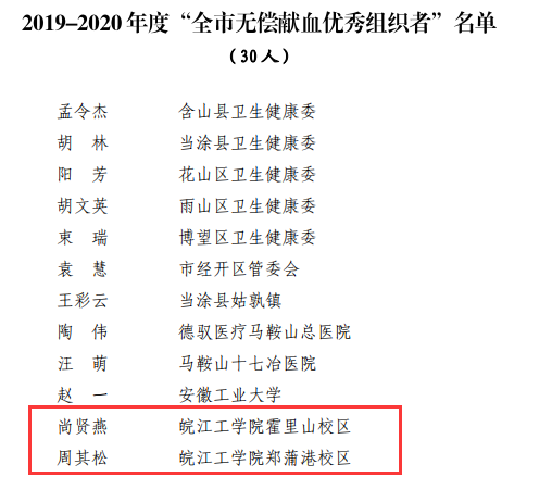 5月26日,马鞍山市发布《关于命名2019-2020年度全市无偿献血先进集体、优秀组织者的通知》。我校荣获2019-2020年度“全市无偿献血先进集体”称号,校团委书记、学工部副部长尚贤燕和新利体育在线官网首页登录入口学工办副主任周其松获“全市无偿献血优秀组织者”荣誉称号。