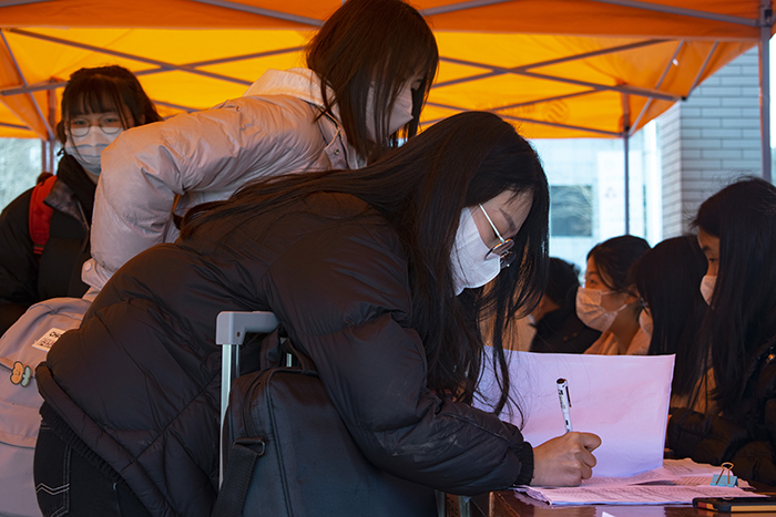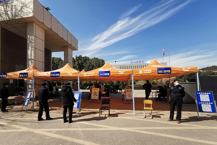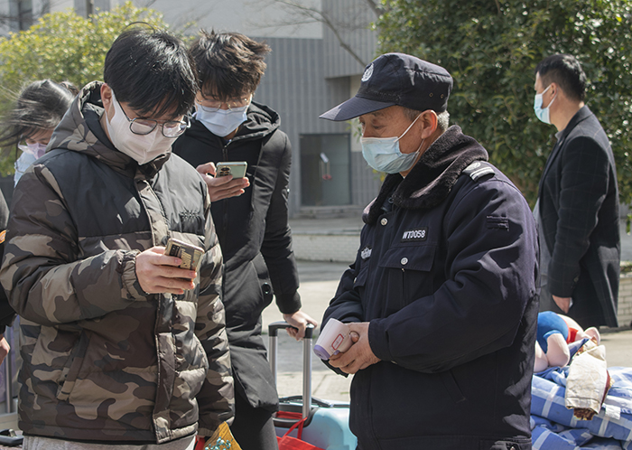 返校学生需持健康码、行程卡“绿码”、核酸检测阴性证明、佩戴口罩,在校门口有序排队,再经过体温检测和返校登记后进校。机械工程学院的王智阳同学说:“在校门口,同学们都积极配合防疫工作,扫码入校并签字登记,一切秩序紧扣然。”