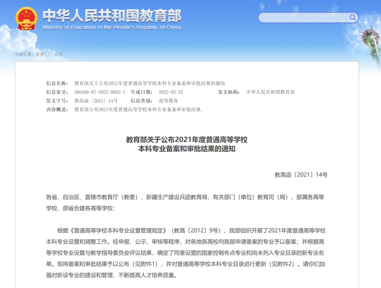 2月24日,教育部官网公布了2021年度普通高等学校本科专业备案和审批结果,我校获批新增4个本科专业——人工智能专业、地理空间信息工程专业、产品设计专业和材料成型及控制工程专业。