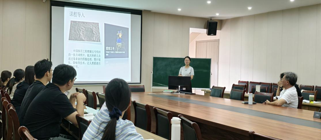 教研室9名教师依次进行了教学展示,通过讲解、案例以及互动环节,将各自所授课程的重点难点一一呈现,并注重课程思政元素的融入。赵璐瑶老师在讲解 Web开发与设计课程时,以“功能导向与视觉体验的平衡”为核心,引入新华网与淘宝网的网页进行对比教学,巧妙串接抗战胜利80周年阅兵大典,让课程教学与思政教育巧妙融合。聂智磊老师在讲解多媒体技术课程时,以我国探月工程新传回的月球表面原始影像为切入点,将航天精神与家国情怀自然融入教学,为后续讲解图像处理技术奠定了生动的基础。