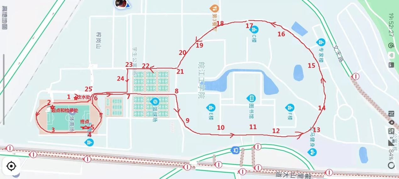 霍里山校区田径场计时台出发绕场地都从田径场门口出→篮球场中间跑到→校环形道→校东门→学校专家楼→教学楼C楼后侧→篮球场西侧道路(靠近宿舍区)→篮球场南侧道路→田径场门口→霍里山田径场计时台。