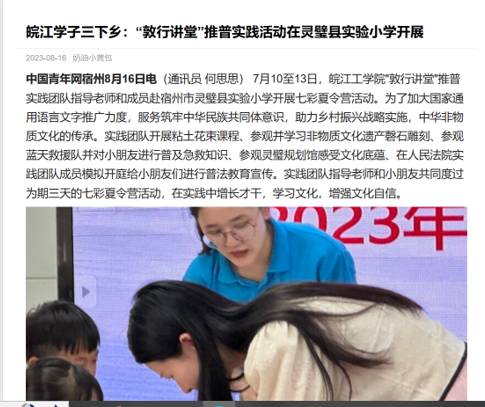 为总结实践成果,她带领实践团积极撰写新闻稿、调研报告,拍摄微团课、微视频等,参与各类新闻报道发表共计21篇。其中国家级平台:学习强国、中青校园等11篇;省级平台:安青报等7篇;地市级平台:灵璧共青团、18新利怎样等共3篇;纸媒1篇(皖江晚报);创立“敦行讲堂”推普实践宣讲团微博账号并官方认证,受中国教育电视台官方微博转载并点赞,浏览量达4万。根据推普助力乡村振兴设置调查问卷并回收1000份,撰写的调研报告成功投稿中青校园。