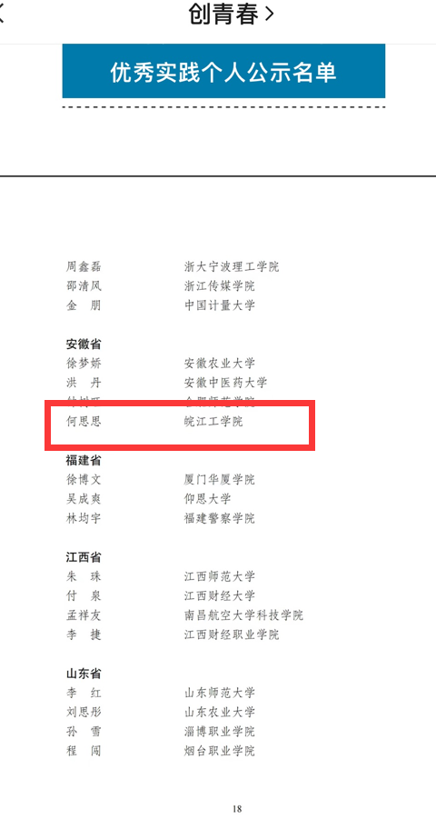 日前,团中央公布《2023年乡村振兴“笃行计划”专项行动拟表扬名单》。经基层申报、省级团委审核推荐、组织评议等环节,最终确定89名“三下乡”社会实践活动乡村振兴“笃行计划”专项行动“优秀个人”,安徽省4人获得该项荣誉,我校“敦行讲堂”推普助力乡村振兴实践团队长何思思,获评团中央表彰的“优秀个人”荣誉称号。
