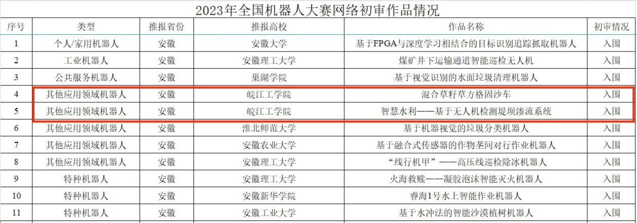 2023年12月17日至19日,由共青团中央、工业和信息化部主办的2023年全国机器人大赛科技创新交流营暨机器人大赛在山东省日照市举办,本次大赛共吸引来自全国30个省、自治区、直辖市及新疆生产建设兵团431所高校的1017件作品参赛。历经省级遴选上报、全国组委会审核,此次大赛共计218件作品入围全国总决赛,安徽省11件,我校《混合草籽草方格固沙车》和《智慧水利— —基于无人机检测堤坝渗流系统》两件作品入围全国终审答辩。经现场激烈角逐,《混合草籽草方格固沙车》荣获国家一等奖,《智慧水利——基于无人机检测堤坝渗流系统》荣获国家二等奖。