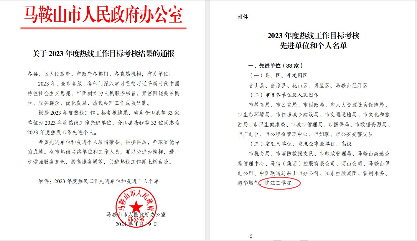 4月19日,接马鞍山市政府通知,我校在2023年度热线工作目标考核中表现出色,荣获市“2023年度热线工作先进单位”荣誉称号,王筱晗同志荣获“先进个人”称号。