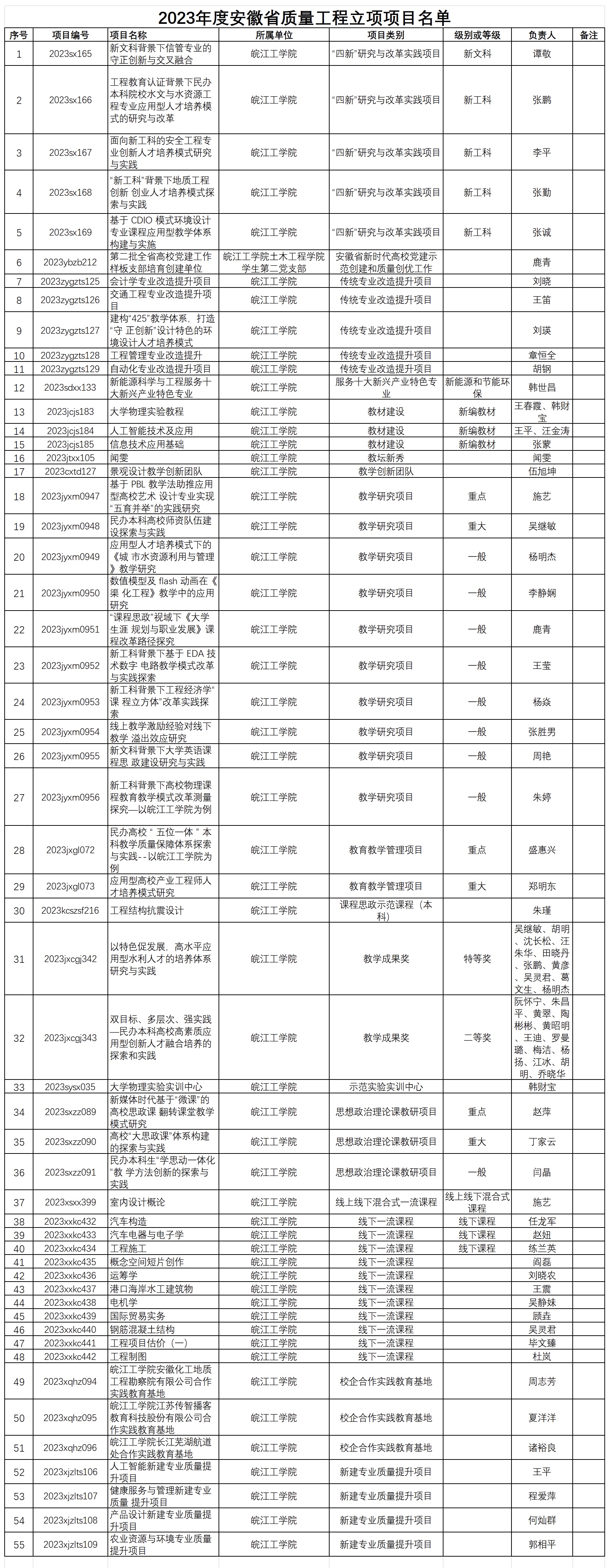 近日,省教育厅发布《安徽省教育厅关于公布2023年高等学校省级质量工程项目名单的通知》(皖教秘高〔2024〕55号),我校申报的55个项目全部获批,其中,课题《民办本科高校师资队伍建设探索与实践》、《应用型高校产业工程师人才培养模式研究》、《高校“大思政课”体系构建的探索与实践》被评定为为重大课题,校长吴继敏团队申报的《以特色促发展,高水平应用型水利人才的培养体系研究与实践》的项目,获省教学成果特等奖。