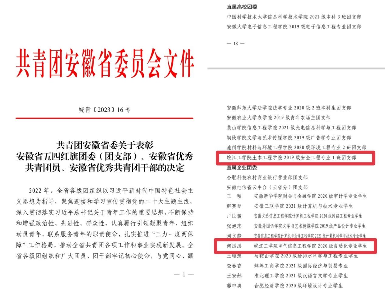 为表彰先进、树立典型,激励全省广大团组织和团员、团干部踔厉奋发、创先争优,5月3日,共青团安徽省委决定,集中表彰一批团学组织先进集体、优秀个人。我校土木工程学院2019级安全工程专业1班团支部荣获2022年度“安徽省五四红旗团(总)支部”、我校电气信息工程学院2020级自动化专业1班学生何思思荣获“安徽省优秀共青团员”称号。