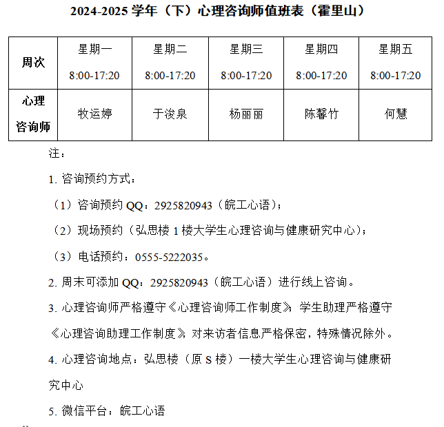 1.按照心理咨询专业规定,每人每次咨询时间约50分钟。请至少提前一天预约(紧急情况除外),接受预约的来访者须准时到达心理咨询室,如有特殊情况无法按时赴约,请提前半天告知。