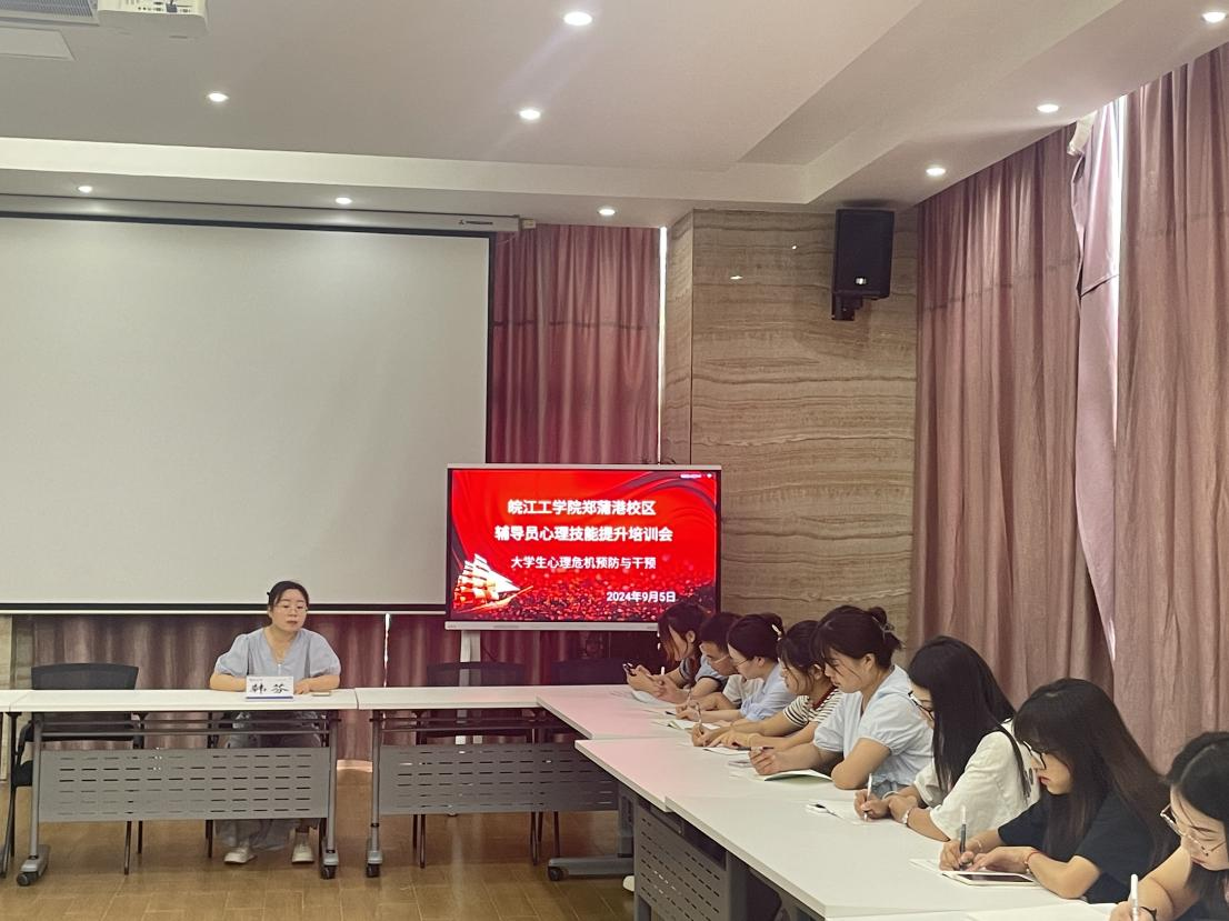 2024年9月5日下午14:00,新利体育在线官网首页登录入口心理中心在一号会议室举办了辅导员心理技能提升培训会,旨在提升校区辅导员对学生心理危机处理的能力,特别是掌握新生入学阶段可能出现的各类心理危机应对方法。此次培训的主题为“大学生心理危机预防与干预”,主讲人为心理咨询中心副主任韩芬,参会人员为校区全体辅导员。