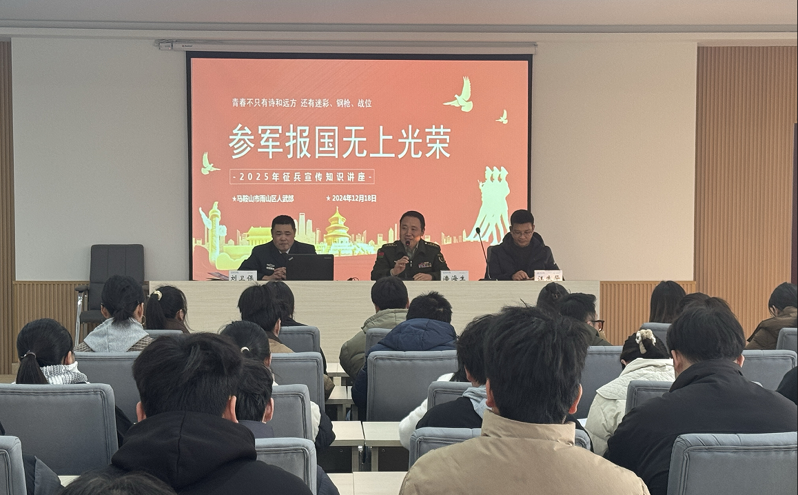 2024年12月18日,为精准推进大学生征兵工作,巩固高校征兵与国防教育主阵地,营造参军报国氛围,我校迎来了由雨山区武装部组织的征兵工作宣讲会。此次宣讲会在学校弘毅楼209报告厅举行。雨山区武装部政委潘海和科长刘卫保莅临指导,学生工作部常务副部长汪朱华、学工部相关负责人、毕业班辅导员、2021级毕业生和其他年级学生代表参加讲座,宣讲会由汪朱华主持。