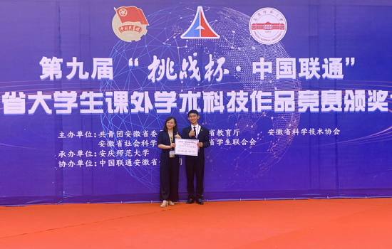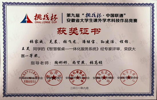 6月底,由团省委、省教育厅、省科协、省社科院、省学联共同主办的第九届“挑战杯”安徽省大学生课外学术作品竞赛获奖名单揭晓。我校“智慧餐桌——一体化服务系统”项目荣获安徽省一等奖,“智能地面除湿机器”、“物联网智能马桶座椅”项目荣获安徽省二等奖,“多模块的波浪发电装置”、“室内外可切换晾衣架”等7个项目荣获安徽省三等奖。另外,在今年开通的“挑战杯”红色专项竞赛活动中,“红色将军乡”、“走红色之旅,忆峥嵘岁月”项目荣获安徽省三等奖。校团委书记尚贤燕及竞赛省一等奖项目负责人19自动化专业张家威于6月20日-21日在安庆师范大学参加本次大赛交流营暨颁奖仪式。