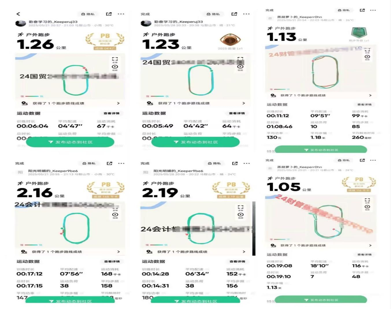 活动的打卡方式采用了当下流行的KeepAPP 记录跑步数据,同学们只需将跑步截图上传至活动专属QQ 群,由健康部部员统一汇总。这种创新的打卡方式不仅方便快捷,还能够让大家实时了解自己的运动数据,增加了活动的趣味性和参与感。此外,活动还特别设置了打卡要求,每位同学每次跑步里程不得少于1 公里,确保了活动的质量和效果。