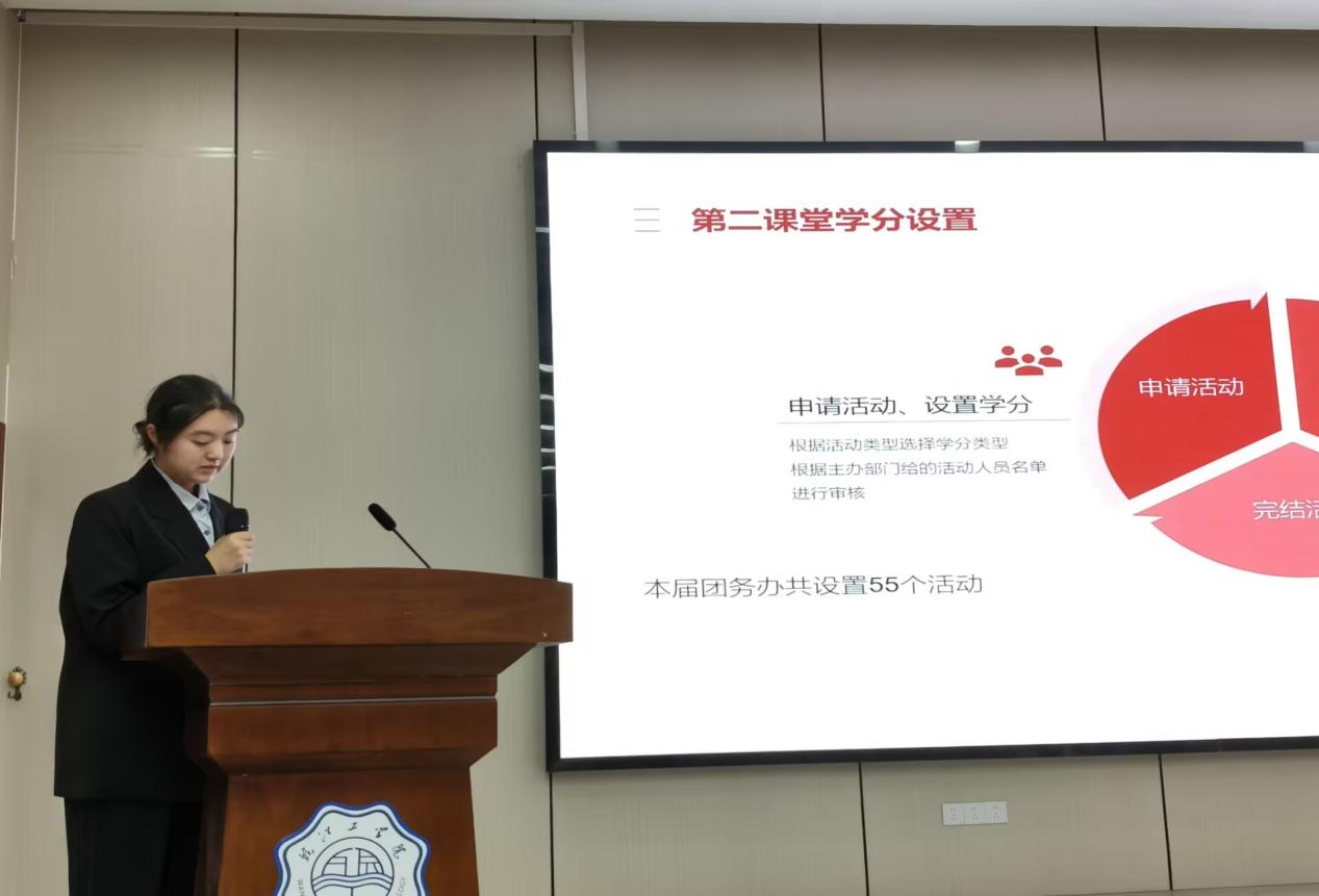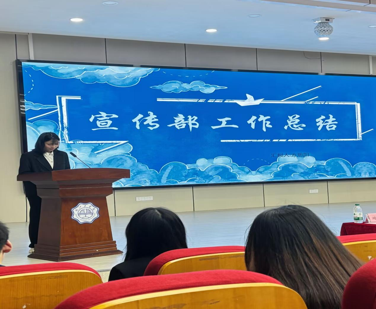 随后进入部门述职环节。学创部(表1)、文体部(表2)、宣传部(表3)、办公室(表4)、团务办(表5)5个部门负责人依次上台,通过图文并茂的PPT展示部门工作成果。办公室重点介绍了完善内部管理制度、提升工作效率的经验;宣传部展示了本学年制作的篇宣传稿件和活动海报;团务办则讲述了第二课堂活动申报流程。每个部门述职结束后,现场都报以热烈掌声。