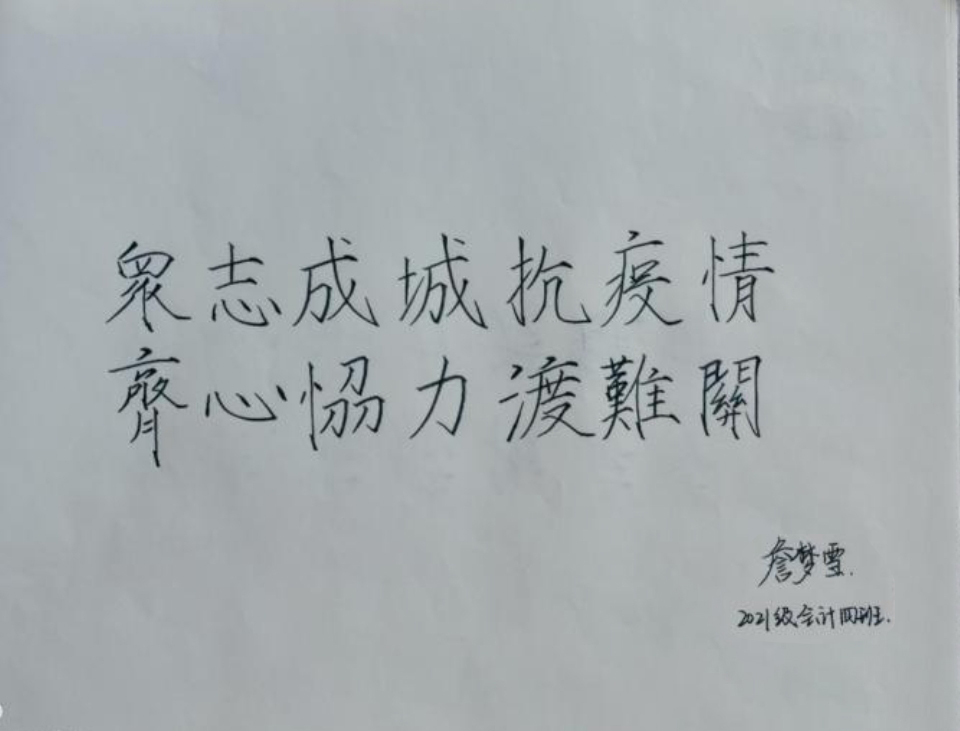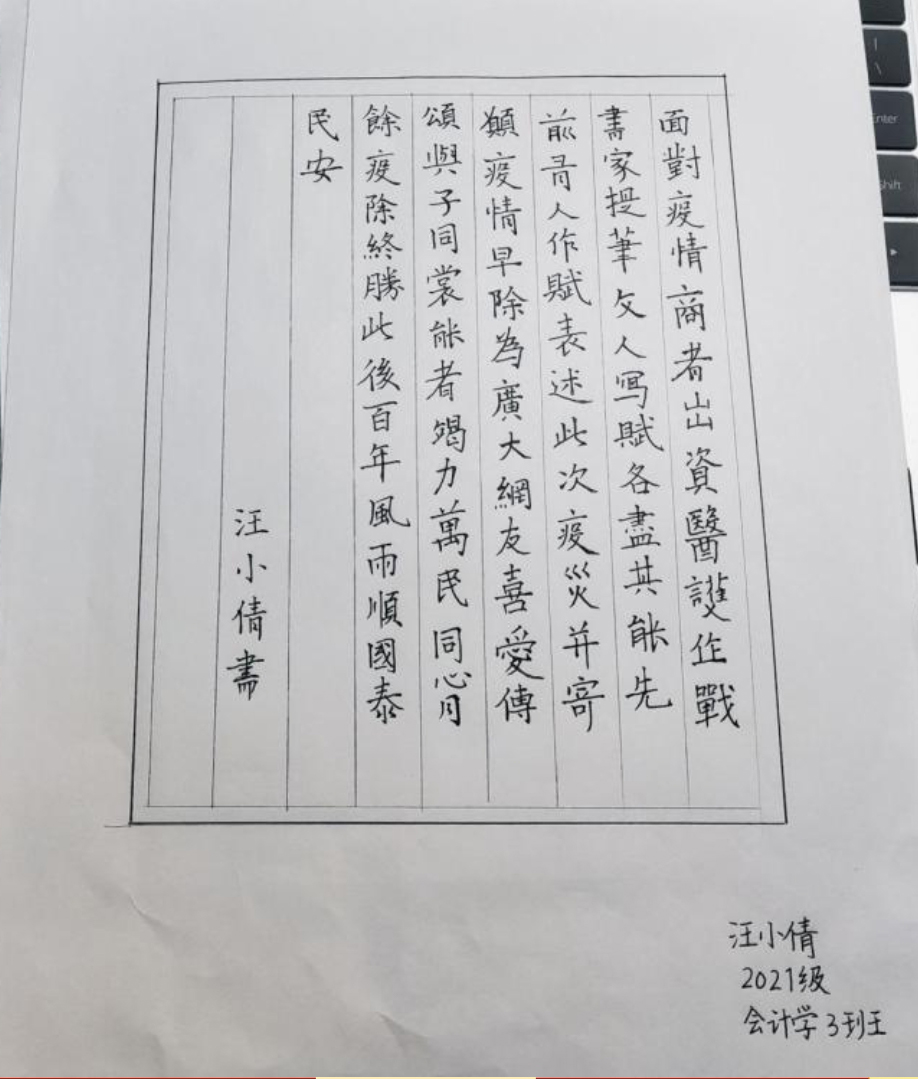 财经学院于2022年4月2日成功举办了以“抗击疫情,书写青春风采”为主题的防疫宣传硬笔书法大赛。