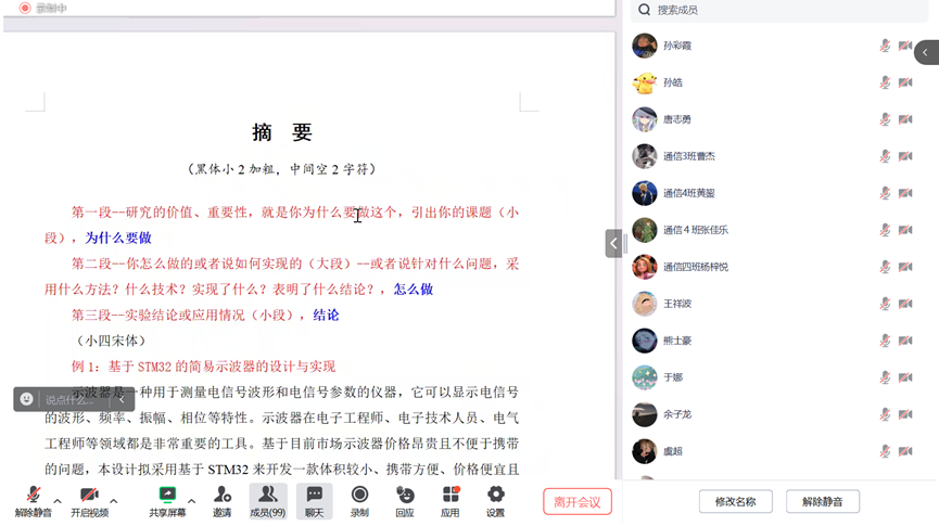 接着,20通信的学生反馈了各自毕业设计的进度以及遇到的问题,比如页码、编号形式、参考文献格式、重复率、程序bug、答辩PPT等问题,与会老师对同学们提出的问题一一进行了解答。