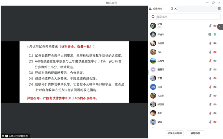 随后,乔晓华又介绍了课程考试归档材料问题,特别指出今年是合格评估关键之年,材料归档要求有更高的标准,详细介绍了这些规范化要求。例如:毕设设计(论文)归档新增中期检查报告、指导环节记录表等;课程考试类新增A/B卷重复率低于15%,平时成绩构成调整等。