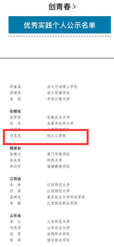 日前,团中央公布《2023年乡村振兴“笃行计划”专项行动拟表扬名单》。经基层申报、省级团委审核推荐、组织评议等环节,最终确定89名“三下乡”社会实践活动乡村振兴“笃行计划”专项行动“优秀个人”,安徽省4人获得该项荣誉,我校“敦行讲堂”推普助力乡村振兴实践团队长何思思,获评团中央表彰的“优秀个人”荣誉称号。
