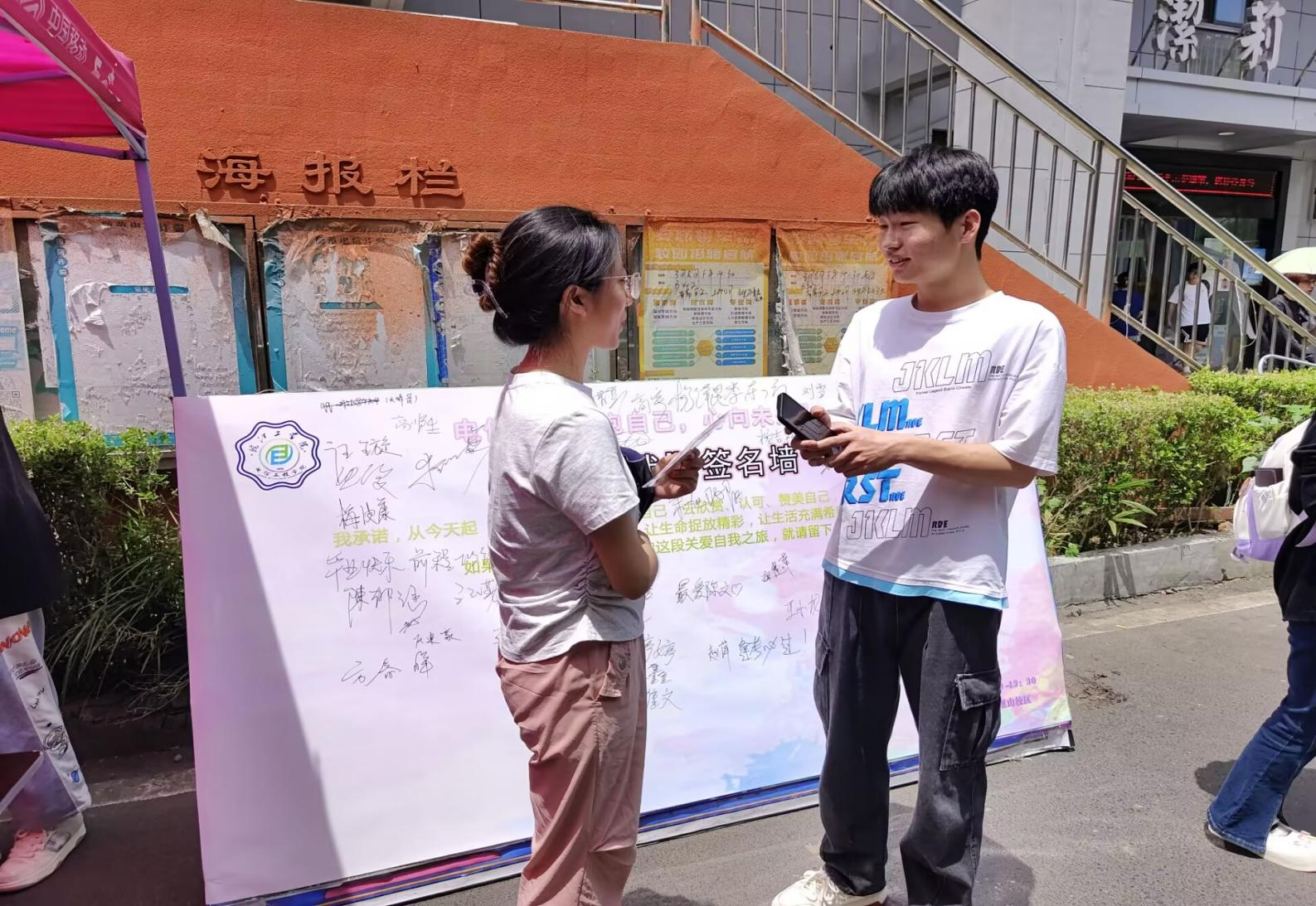 参与此次活动的工作人员分别是学习部部长肖鹏,学习部部长陈豪龙,宣传部部长杨力玮,实践部部长顾剑豪,文体部部长徐乐。活动开始之际,路过同学纷纷展现出浓厚兴趣,积极参与,在提供“我爱我”的签名墙上签名或留下祝福的话语;除此之外,活动现场还设置了随机采访,不少同学分享了理想中的自己是什么样的,或是分享下感到自己幸福的瞬间。