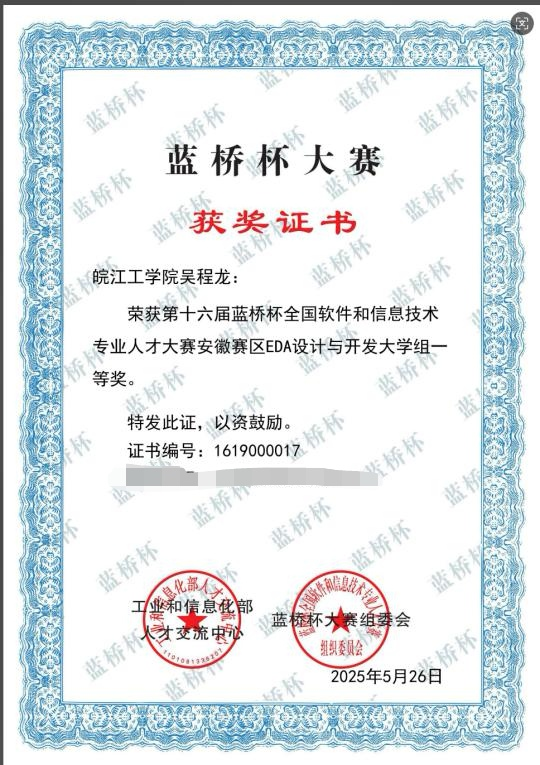 2025年6月15日,第16届蓝桥杯全国软件和信息技术专业人才大赛全国总决赛在合肥工业大学圆满落幕。18新利怎样电信工程学院22自动化专业的吴程龙同学凭借扎实的专业知识和出色的现场发挥,以及指导老师陶俊和丁宗贺的指导下,在众多参赛选手中脱颖而出,荣获省一等奖(国家三等奖)。