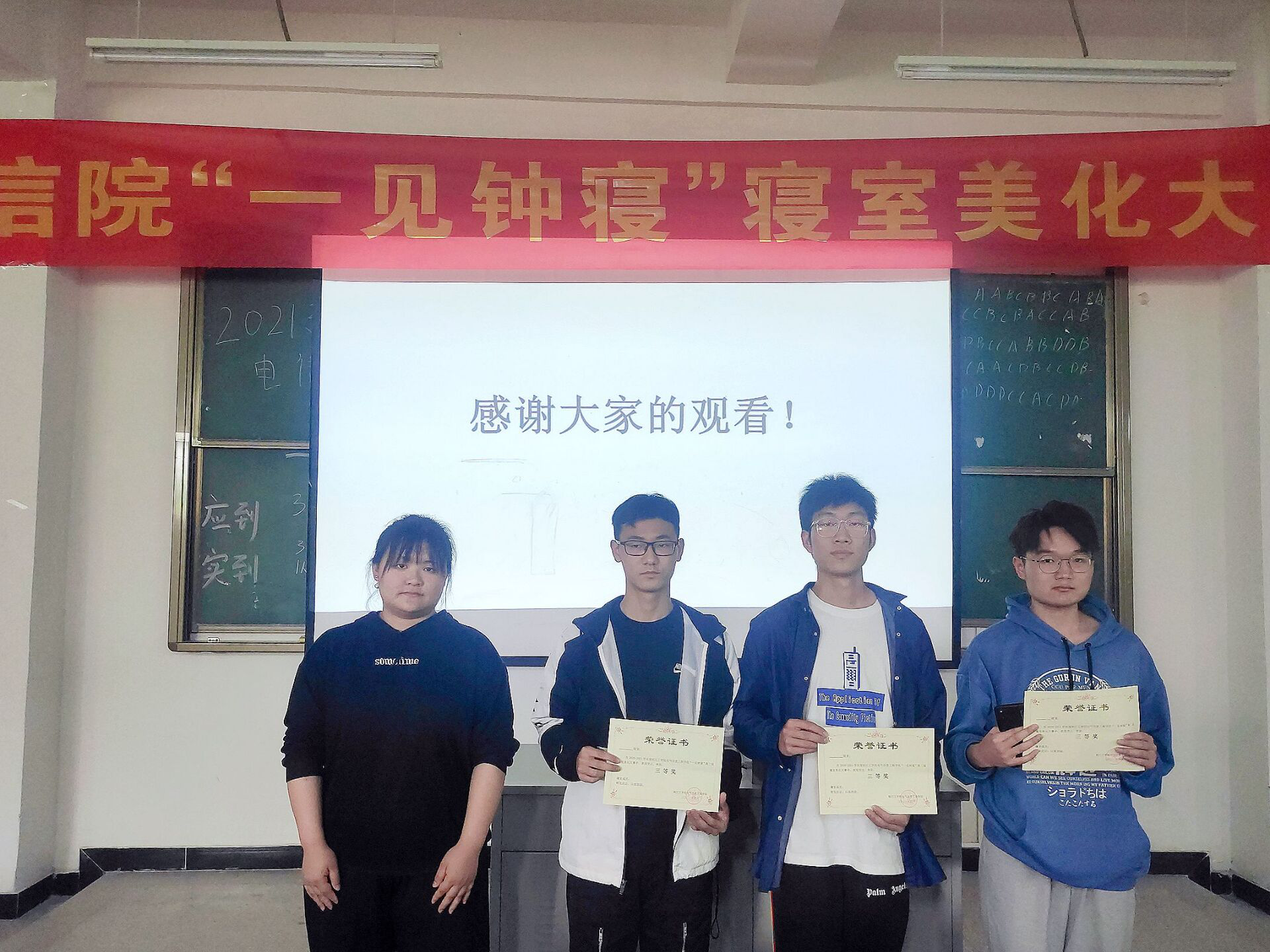2021年4月18号14:30,为进一步推进学生寝室精神文明建设,营造良好的宿舍文化氛围,电气信息工程学院在B202教室举办“一见钟寝”寝室美化大赛。心理部部长毛思维、外联部部长郑琦、办公室副主任胡江颖担任了此次比赛的评委。
